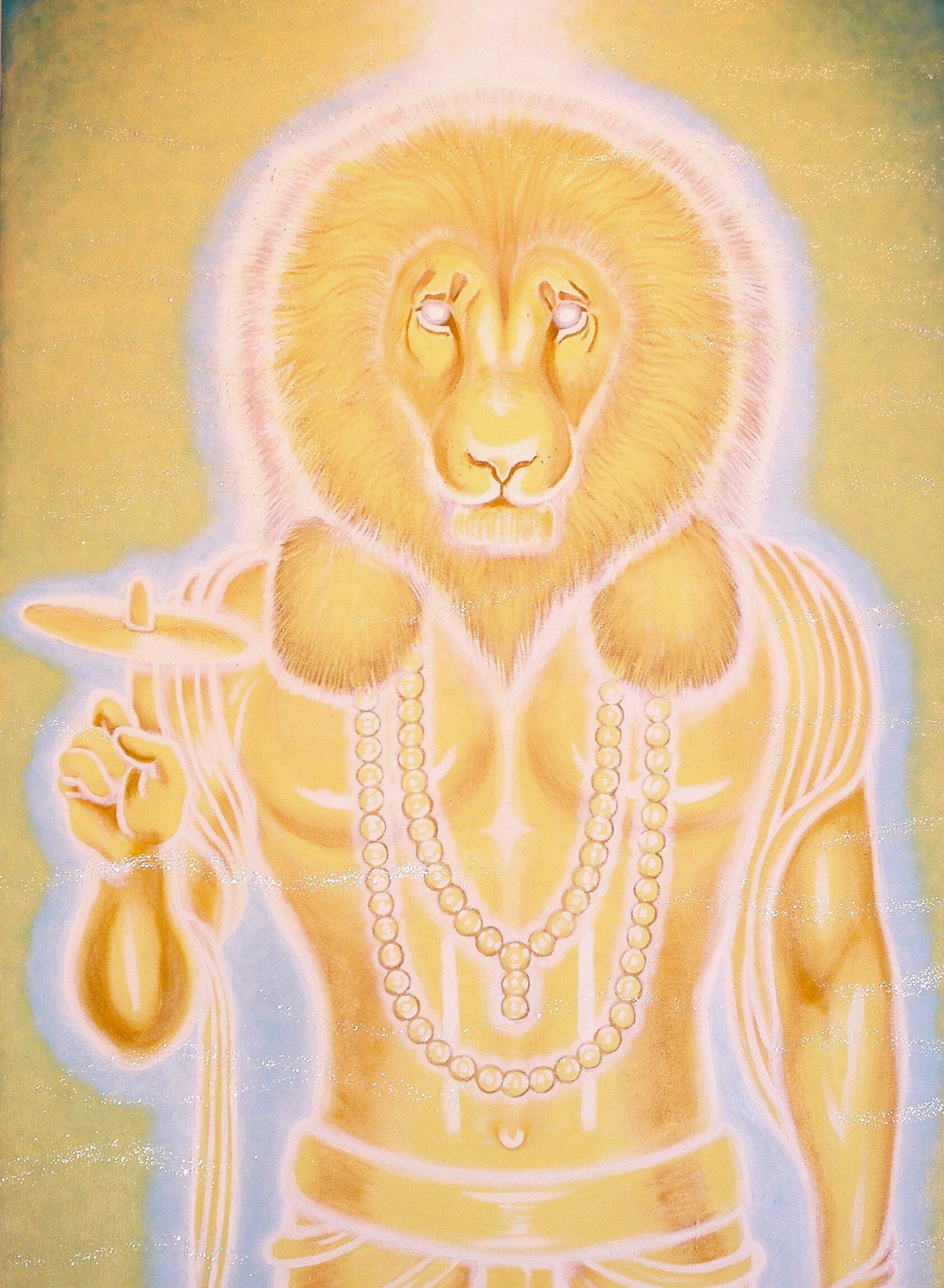 ヌルシンハ神の壮麗な姿を美しく表現したキャンバスプリントです。この作品は、力強さと神秘的な魅力を兼ね備えたヌルシンハ神の表情を丁寧に捉え、あなたの空間に深い感動と癒しをもたらします。